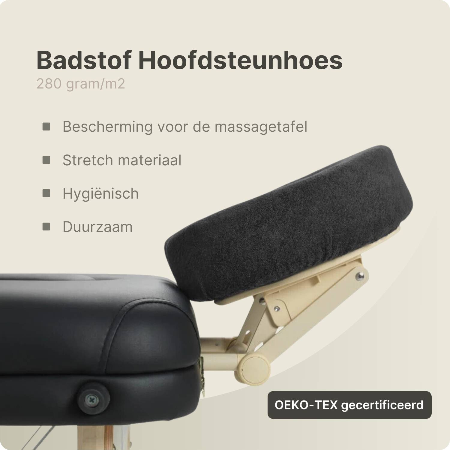 Hygiëne is essentieel in elke praktijk. Dit hoesje beschermt de bekleding van de hoofdsteun tegen huidoliën, zweet en make-up, wat de levensduur van de apparatuur verlengt. Het materiaal is OEKO-Tex® gecertificeerd, wat betekent dat het vrij is van schadelijke stoffen en veilig is voor direct huidcontact. Bovendien is de stof thermogefixeerd, waardoor het hoesje vormvast blijft en niet krimpt in de was.